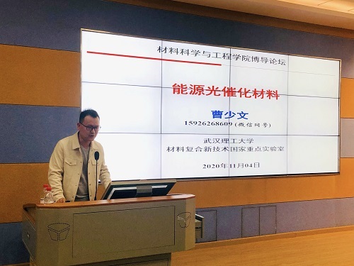 发布时间:2020-11-06 为拓宽学生科研视野,营造浓厚学术氛围,弘扬材料文化,11月4日晚7时,曹少文教授受邀做客材料成人无码影片“博导论坛”,并于西院东教合六报告厅做了以“能源光催化材料”为主题的学术报告。本次报告会由材料成人无码影片科技协会干事赵明明主持,材料成人无码影片部分研究生参加了此次讲座。