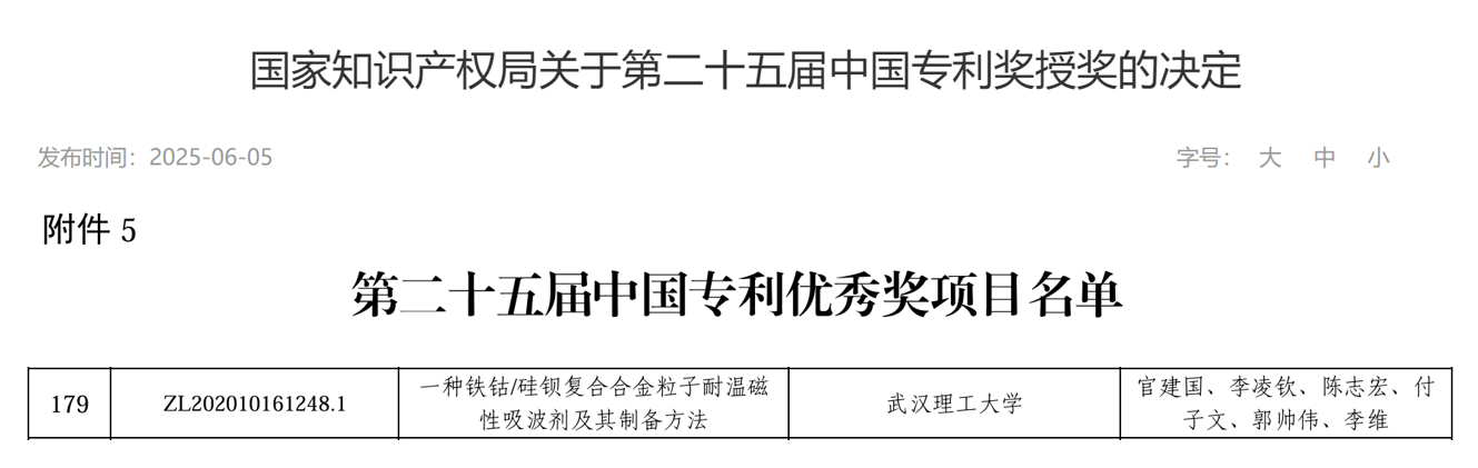 发布时间:2025-06-24近日,国家知识产权局针对在实施创新和推动经济社会发展等方面作出显著贡献的专利权人、发明人(设计人)以及相关组织者给予表彰。成人无码影片青年教师陈志宏教授作为核心骨干的专利“一种铁钴/硅钡复合合金粒子耐温磁性吸波剂及其制备方法”获第二十五届中国专利优秀奖。目前,陈志宏教授已有9项国家发明专利分别在武汉双虎涂料股份有限公司、武汉心电科技有限公司、武汉康泰威科技有限公司等多家企业实现成果转化,并入选湖北省经信厅第五批“科技副总”,助力区域经济发展