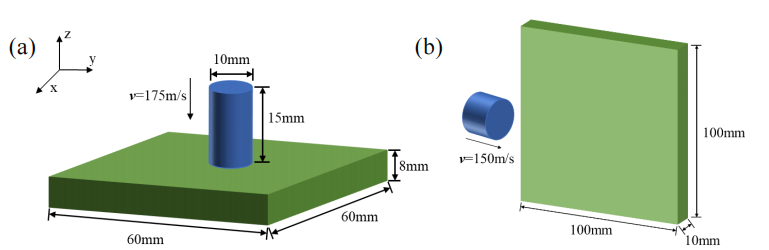 (a)弹体对陶瓷板的正面撞击;(b)弹体对陶瓷板的侧面撞击。