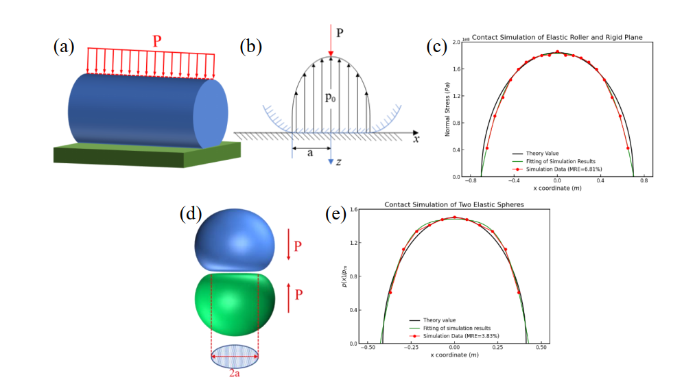 (a)弹性滚子与刚性平面在载荷作用下接触的三维示意图;(b)滚子与平面在载荷作用下接触的接触压力分布二维示意图;(c)滚子与平面接触的模拟应力与理论应力对比;(d)两个相同弹性球体在外部载荷作用下接触的示意图;(e)球体与球体接触的归一化接触压力分布。