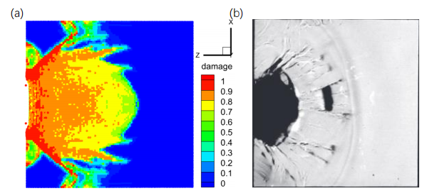图4对于侧面撞击下的陶瓷板,PD模拟结果与实验观察结果的对比: